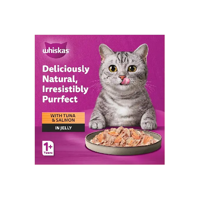 Whiskas Purrfectly – غذای مرطوب برای گربه بالغ (1+ سال)، طعم ماهی تن و سالمون در ژله – 85 گرم